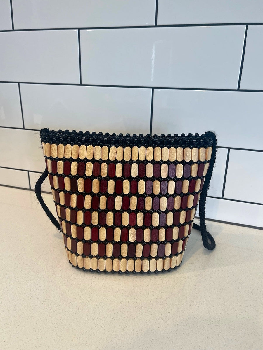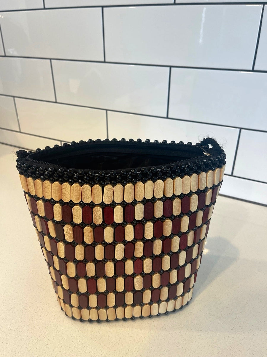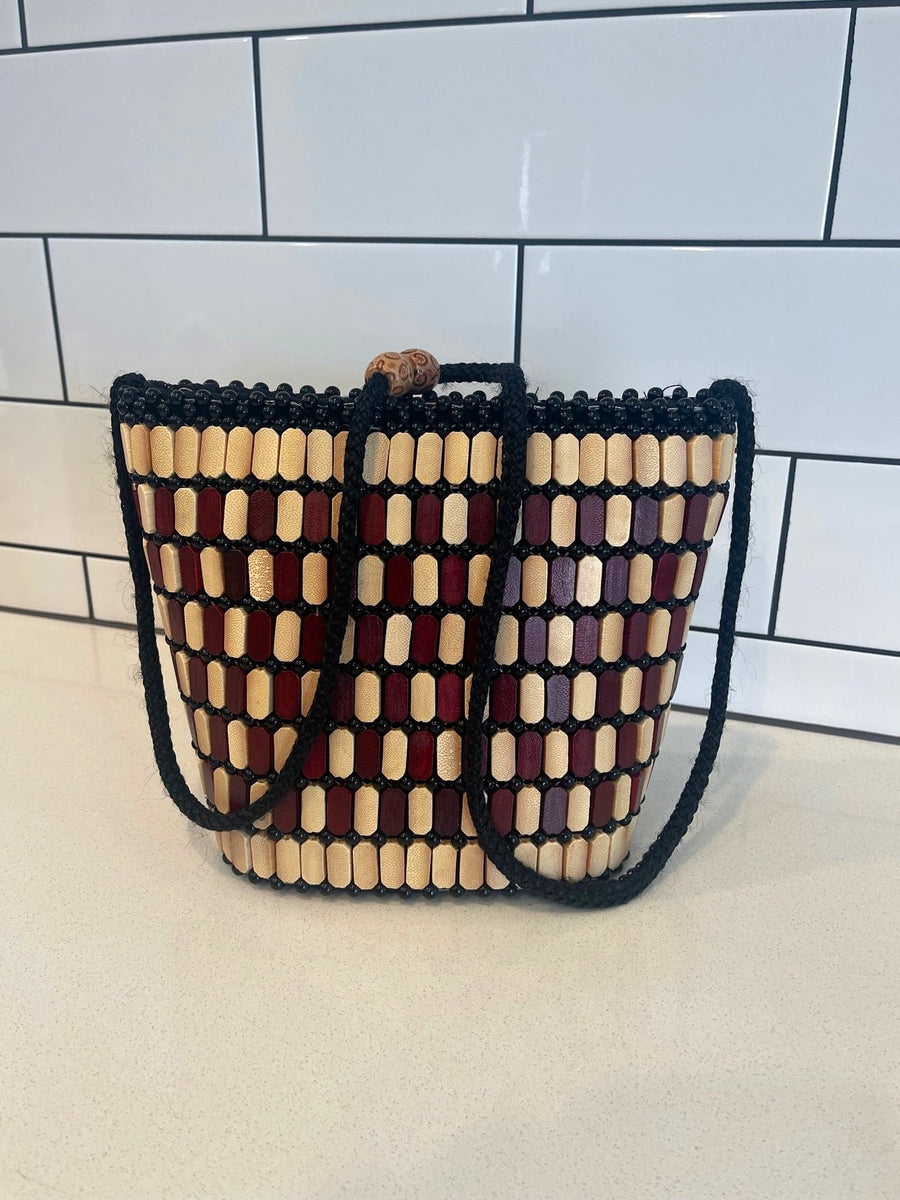 This African beaded Tot handbag features a multicolored design hand-crafted with colorful wood beads. It is 100% handmade, making it a unique and stylish accessory with a beautiful African aesthetic. Perfect for a crossbody bag, it is sure to make a statement.